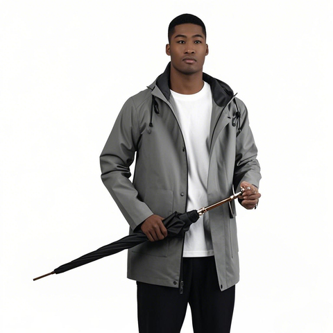 पुरुषों का जैतून का हरा ठोस काले लंबे कोट हुड और वर्षाकोट-यूरोप में अत्यधिक लोकप्रिय है, जिसमें कार्यात्मक वाटरप्रूफिंग की विशेषता है।